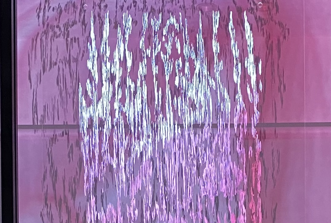 アクリル板に白く描いた木目がスクリーンとなり、コロナ禍で育て始めた植物の写真から厳選して動画を自作し、プロジェクターで照射する。木目がまるで彩色されたように次々と色を変え、音響の効果もあり圧倒的な空間を創出。