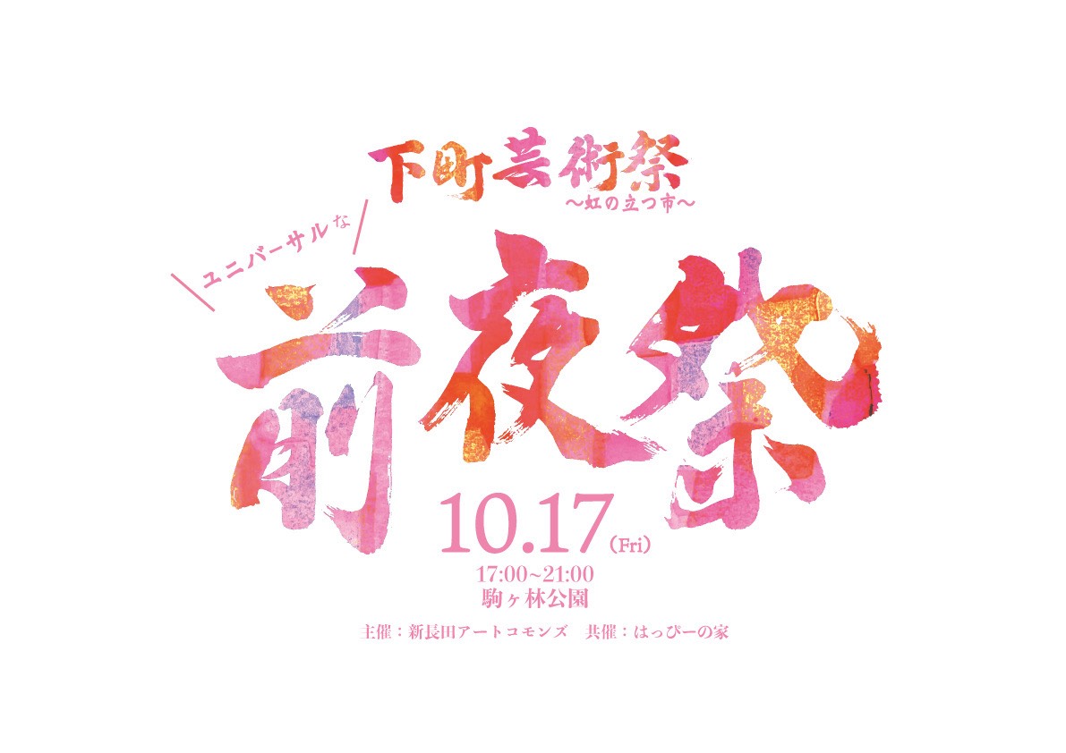 下町芸術祭ユニバーサルな前夜祭 駒ヶ林公園 パフォーマンス 物販 音楽の演奏 飲食 下町芸術祭が気になってた人に朗報!開幕前夜、ユニバーサルな前夜祭やります。 看護師・介護士滞在!年齢不問、国籍不問、障がいの有無不問。 誰もが楽しめるユニバーサルなDJナイト。 駒ヶ林公園で待ってます。 開催日程 10月17日17時から21時 会場 駒ヶ林公園(神戸市長田区南駒栄町1−73) Prev